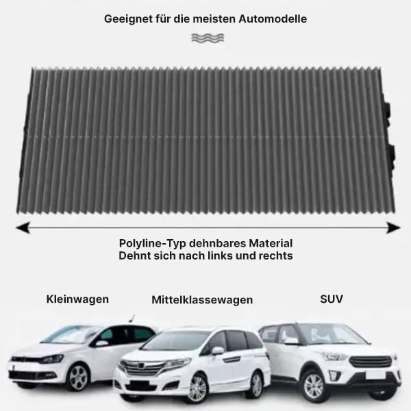 Dieser Sonnenschutz ist so konzipiert, dass er für eine Vielzahl von Fahrzeugen passt, einschließlich Autos, Transportern, Lastwagen und SUVs. Er hat eine universelle Passform, da Sie die Breite einfach auf das gewünschte Maß zuschneiden können.